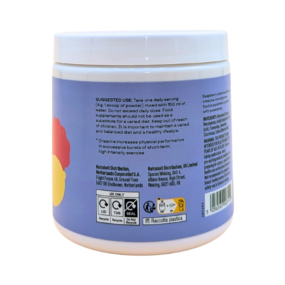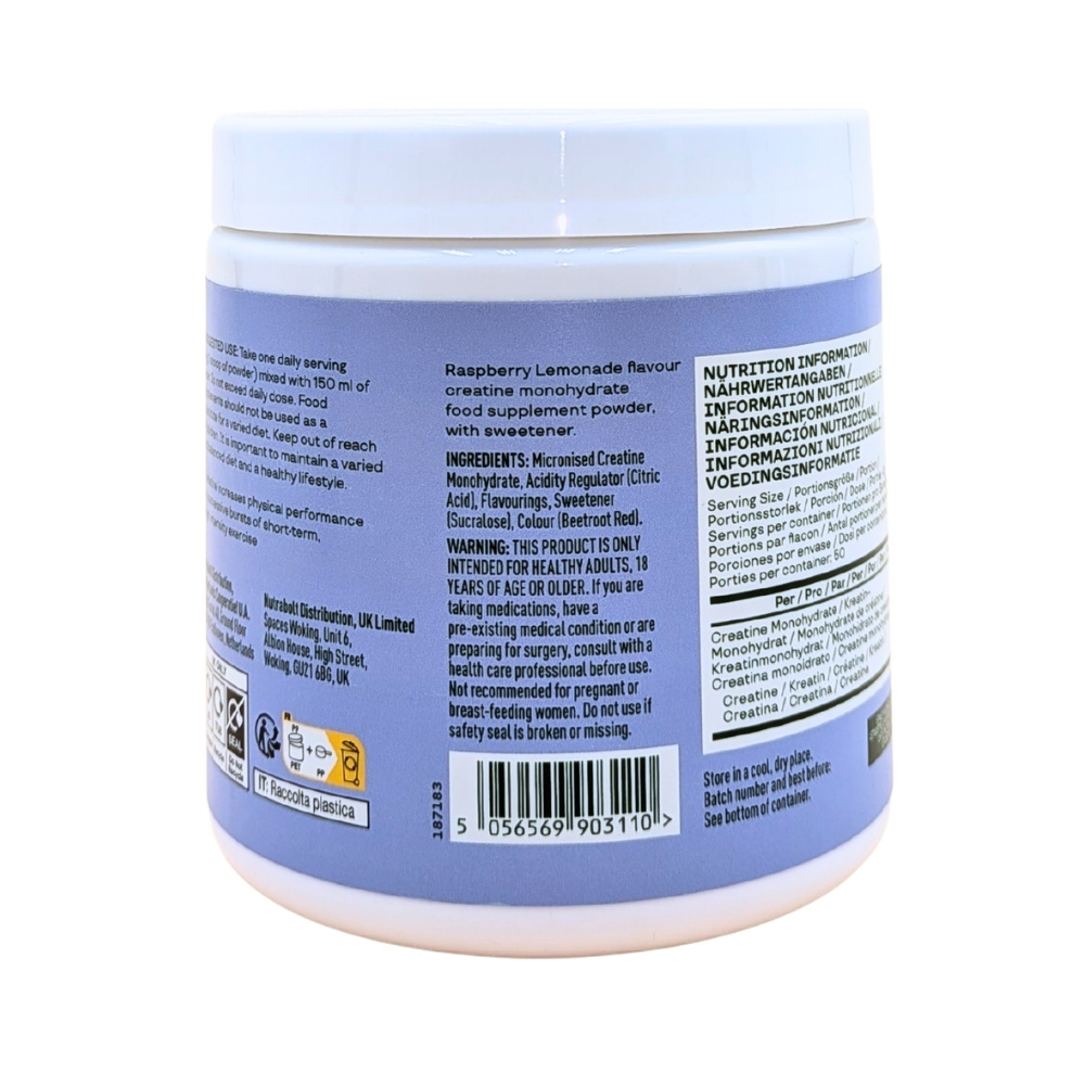 • Micronised creatine monohydrate with a Raspberry Lemonade flavour.