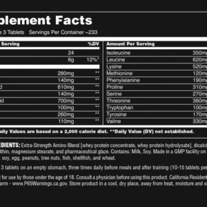 Ingredients: Extra-Strength Amino Blend (whey protein concentrate, whey protein hydrolysate), dicalcium phosphate, stearic acid, lecithin, magnesium stearate, pharmaceutical glaze. Contains milk and soy. Manufactured in a facility that also processes egg, peanuts, tree nuts, fish, shellfish, and wheat.