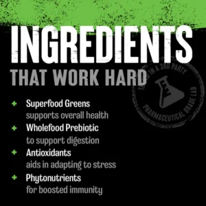 Ingredients: Greens Food Blend (Wheat Grass (leaf), Spirulina (whole plant), Chlorella (whole plant), Alfalfa (herb), Kale (leaf), Astragalus (root)); Phytonutrient & Antioxidants Complex (Red Beet Root, Turmeric (root), Green Tea Leaf Extract, Coffee Bean Extract, Citrus Bioflavonoids (peel), Acai (berry) Juice Extract, Goji (berry), Maca Root Extract, Grape Seed Extract, Pine Bark Extract, Ginkgo Biloba (leaf), Lutein, Lycopene); Prebiotic & Digestion Blend (Inulin, Apple Pectin, Ginger (root), Bromelain, Papain, Acid Protease, Lipase); Other Ingredients (Dicalcium Phosphate, Microcrystalline Cellulose, Gelatin (capsule), Hydroxypropyl Cellulose, Magnesium Stearate, Stearic Acid, Maltodextrin).